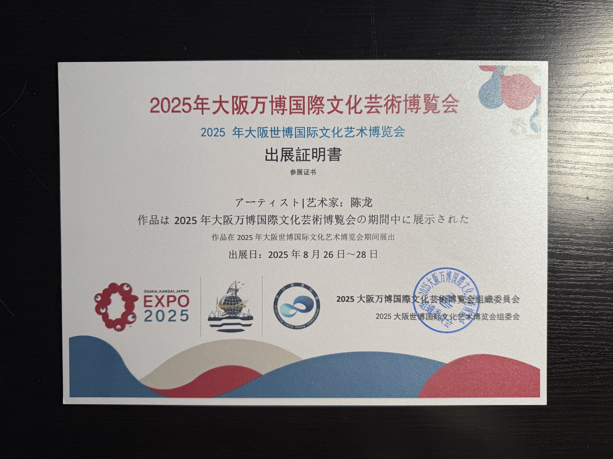 2025年8月,经过评委会认真审核,陈龙的5件作品入选2025年大阪世界博览会授权联合举办的大阪世博国际文化艺术博览会,线上展期自2025年8月26日至10月10日,5张作品均在日本〒540-0029 大阪府大阪市中央区本町橋2−5现场大屏幕滚动播出。
