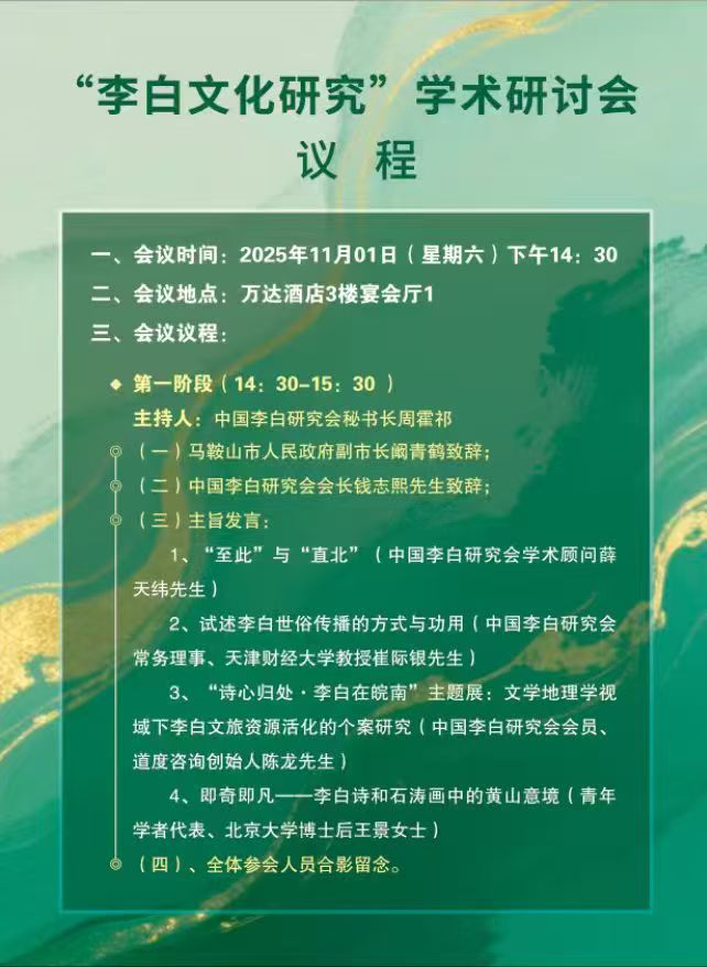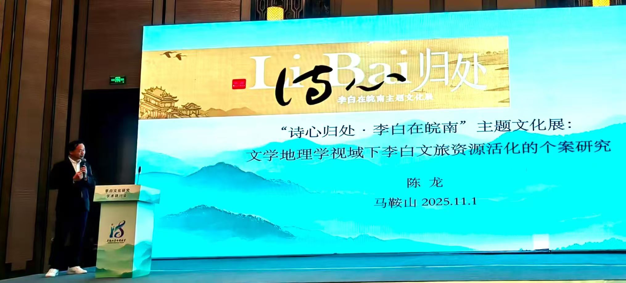 2025年11月1日,出席马鞍山中国李白研究会“李白文化研究”学术研讨会,提交论文《“诗心归处·李白在皖南”主题展:文学地理学视域下李白文旅资源活化的个案研究》并作主旨演讲。