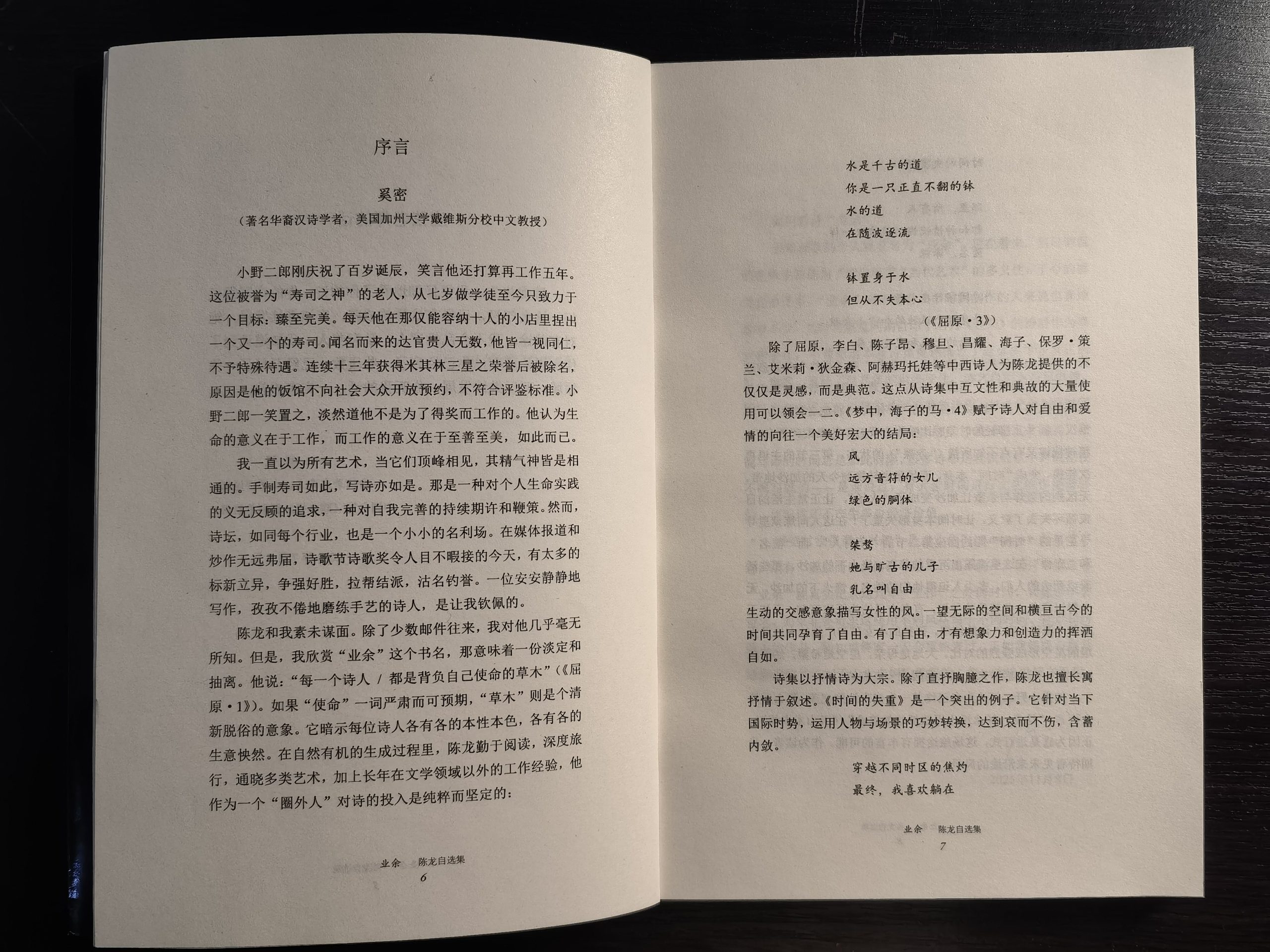 • 美国加州大学戴维斯分校中文教授奚密评语:“在自然有机的生成过程里,陈龙勤于阅读,深度旅行,通晓多类艺术……除了屈原,李白、陈子昂、穆旦、昌耀、海子、保罗·策兰、艾米莉·狄金森、阿赫玛托娃等中西诗人为陈龙提供的不仅仅是灵感,而是典范。这点从诗集中互文性和典故的大量使用可以领会一二。”