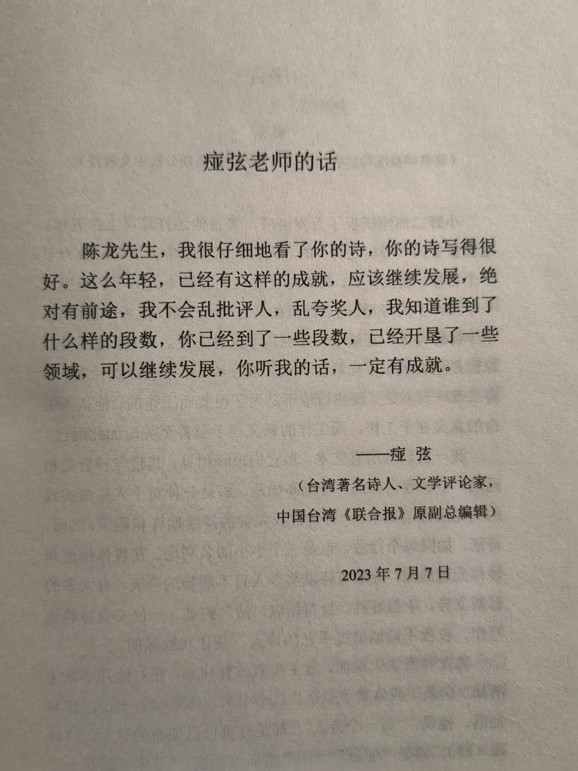 • 陈龙先生,我很仔细地看了你的诗、你的诗写得很好。这么年轻,已经有这样的成就,应该继续发展,绝对有前途,我不会乱批评人,乱夸奖人、我知道谁到了什么样的段数,你已经到了一些段数,已经开垦了一些领域,可以继续发展,你听我的话,一定有成就。——痖弦(台湾著名诗人、文学评论家,中国台湾《联合报》原副总编辑)