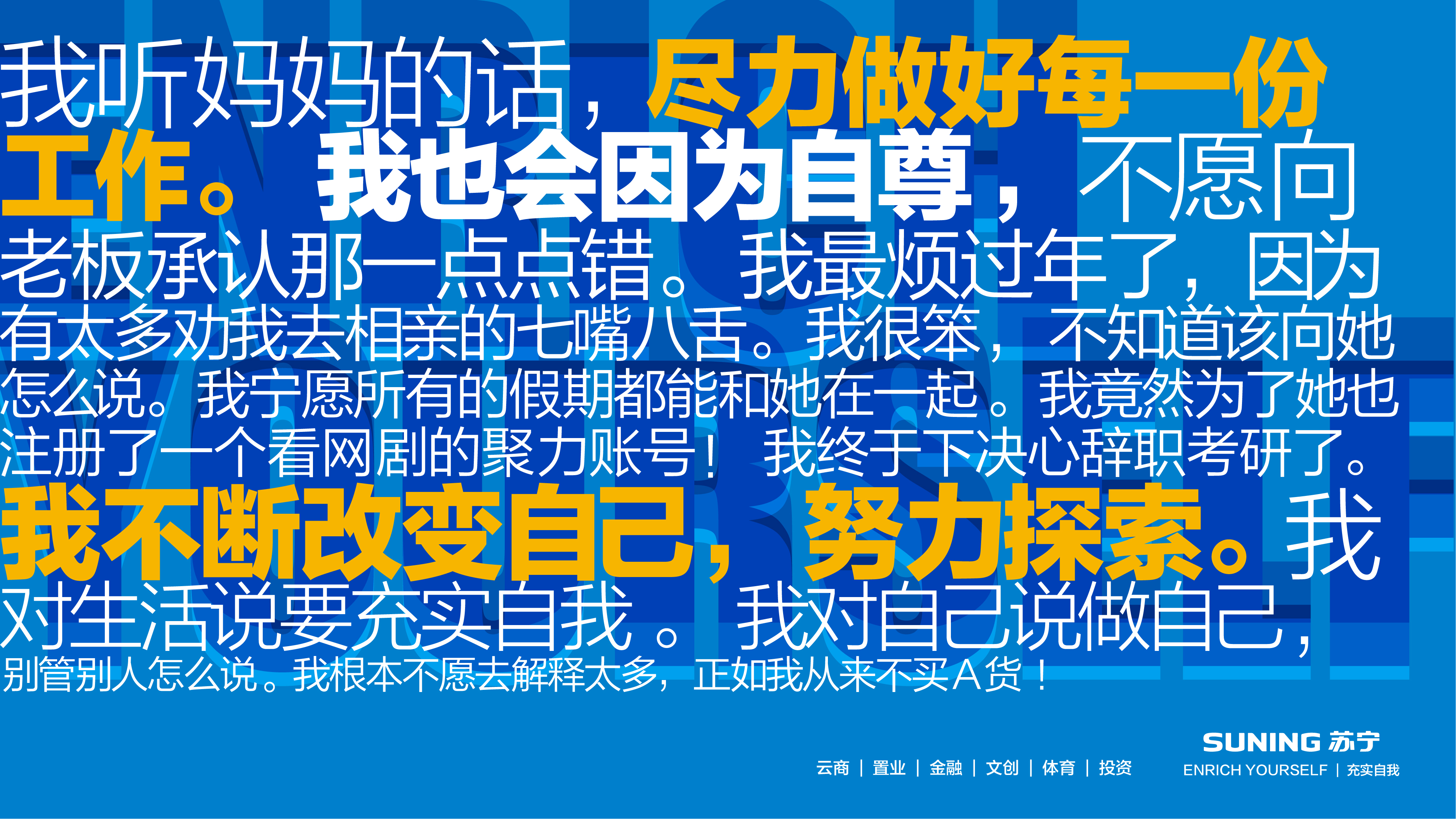 When Suning has been transformed from a retailer into a group with six major industries, its brand image is too messy, in the challenge of not forming a unified cognition. After a group of high-level executives interviews, consumers and competitors research and analysis, We put forward the core concept of True Me, targeting the consumers “values” across generations, consumption and life.